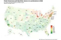 The United States Census Bureau published an infographic in 2023 entitled Detailed Races and Ethnicities in the United States and Puerto Rico: 2020 Census. This data source showed that the number of Americans in 2020 who cited their ethnic group as Polish was 2,686,362 alone and 8,599,601 alone or in any combination.[16] The proportion of the former to the latter was 31.2%, thus indicating that a substantial majority were of mixed origin. The adjacent table shows the Polish American population going back to 1900.