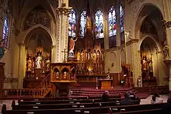 The Central Archives of American Polonia is a research center at the Orchard Lake Schools.[42] The archives compiles data about the history of Christianity among Polish Americans. Its General List of Polish Parishes counts 1.036 Roman Catholic parishes of a Polish character that were established over the history of the United States. A portion of these parishes are no longer active. The first parish, Immaculate Conception, was established in Panna Maria, Texas in 1854.[43] The dioceses with the largest concentration are the Archdiocese of Chicago at 64, the Diocese of Buffalo at 50, the Diocese of Scranton at 49, and the Archdiocese of Detroit at 40. The Polish Roman Catholic Union of America was instrumental in establishing many churches in the dioceses of Chicago, Detroit, and Buffalo.[44] The monumental scale of some of these urban churches led to the creation of a new genre of architecture known as Polish cathedral style. Parishes were established in rural areas such as farming communities and mining towns as well. The General List of Polish Parishes indicates that 177 parishes were established in Pennsylvania, 122 in New York, 118 in Michigan, 112 in Wisconsin, and 99 in Illinois.