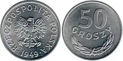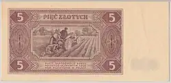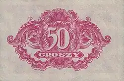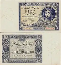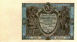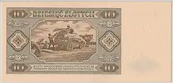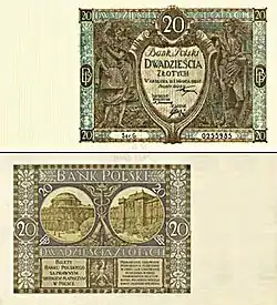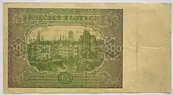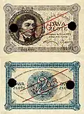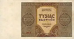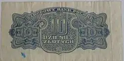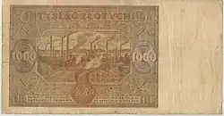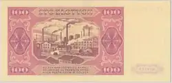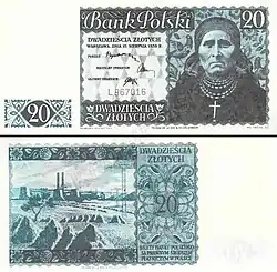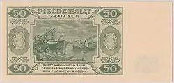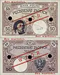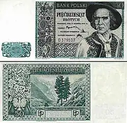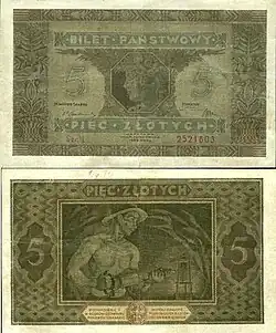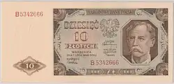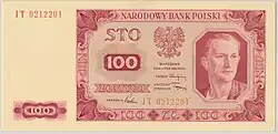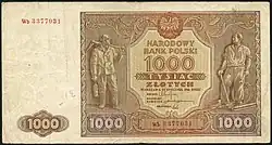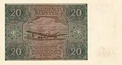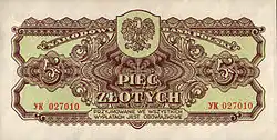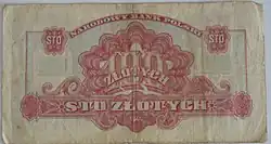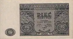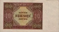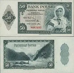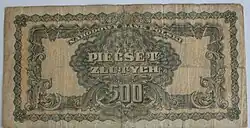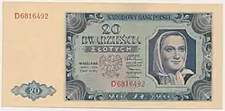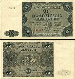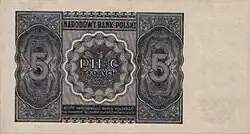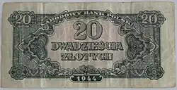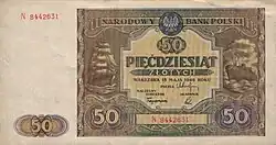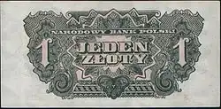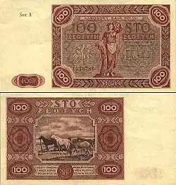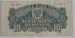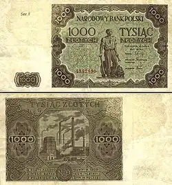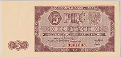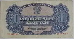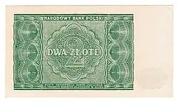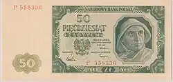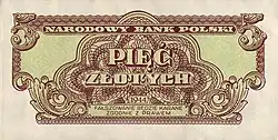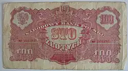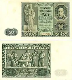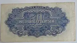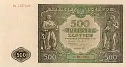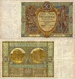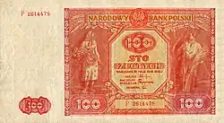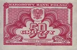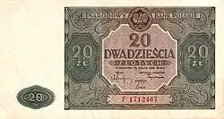 On 15 January 1945, the National Bank of Poland was formed, and a new printing plant opened in Łódź.[28] The series II and III notes were designed by Ryszard Kleczewski and Wacław Borowski. The first three series were taken out of circulation in line with legislation signed on 28 October 1950, covering the introduction of a new złoty with a revived coinage system.[29]