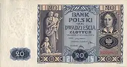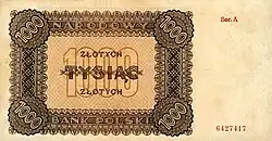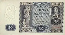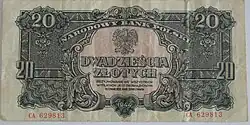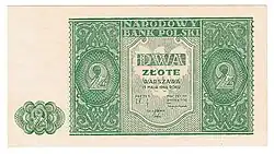 Under the occupation during World War II, the Germans created an Emissary Bank (Bank Emisyjny) in Kraków, as Polish bank officials fled to Paris in France.[24] It started operating on 8 April 1940, and in May, old banknotes from 1924 to 1939 were overstamped by the new entity.[25] Money exchange was limited per individual; the limits varied according to the status of the person. The fixed exchange rate was 2 złoty per 1 Reichsmark.[26] A new issue of notes appeared in the years 1940–1941.[27]
