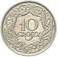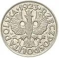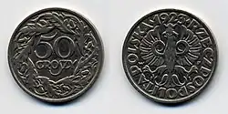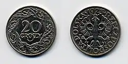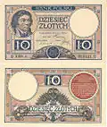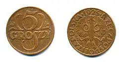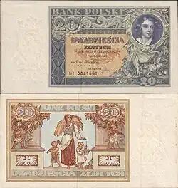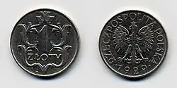 The złoty was reintroduced by the Minister of Finance, Władysław Grabski, in April 1924.[18][19] It replaced the marka at a rate of 1 złoty to 1,800,000 marks and was subdivided into 100 grosz rather than the traditional 30 grosz.[20]