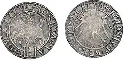 The first form of tangible currency in Poland was the denarius (denar), which began circulating in the 10th century.[9] During this period, Polish coinage had a single face value and was minted from bullion (primarily silver, but also compounded with copper and other precious metals).[10] The standard unit of mass used at the time was the grzywna rather than the pound, with one grzywna being equivalent to 240 denars.[11] From the 1300s to the mid-16th century, the Prague groschen (or groat) dominated the market and its high supply reduced the demand for a national currency across Central Europe.[12] Certain cities and autonomous regions of the Polish Kingdom held the privilege of minting their own currency, for instance the shilling (szeląg) in the Duchy of Prussia, which Poland co-adopted in 1526.[13]