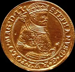 Initially, the term "złoty" (lit. 'the golden one') was used in the 14th and 15th centuries for a number of foreign gold coins, most notably Venetian ducats, florins and guldens. In 1496, the Sejm parliament debated on the creation of a domestic currency and approved the złoty, which until then acted as a unit of account.[14] An exchange rate of 30 grosz was imposed for one gold piece, which remained the traditional subdivision until the 19th century.[14] In the years 1526–1535, as part of an extensive monetary reform proposed by Nicolaus Copernicus and Justus Decius, King Sigismund I defined the złoty as a legal tender in the minting ordinance on 16 February 1528.[15]