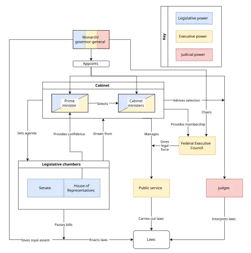 Separation of powers is the principle the power of state should be shared between multiple bodies, in order to avoid the concentration of power in one entity.[6] The legislature proposes and debates laws that the executive then administers, and the judicial arbitrates cases arising from the administration of laws and common law. However, in accordance with Westminster system, there is no strict separation between the executive and legislative branches, with ministers required to also be members of the legislature.[7][8] Only the High Court can deem if a law is constitutional or not.[6]