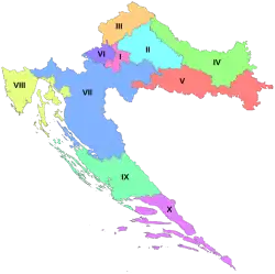 Croatia was first subdivided into counties (Croatian: županija) in the Middle Ages.[34] The divisions changed over time to reflect losses of territory to Ottoman conquest and the subsequent recapture of the same territory, and changes to the political status of Dalmatia, Dubrovnik and Istria. The traditional division of the country into counties was abolished in the 1920s, when the Kingdom of Serbs, Croats and Slovenes and the subsequent Kingdom of Yugoslavia introduced oblasts and banovinas respectively.[35] After 1945 under Communist rule, Croatia, as a constituent part of Yugoslavia, abolished these earlier divisions and introduced municipalities, subdividing Croatia into approximately one hundred municipalities. Counties, significantly altered in terms of territory relative to the pre-1920s subdivisions, were reintroduced in 1992 legislation. In 1918, the Transleithanian part of Croatia was divided into eight counties with their seats in Bjelovar, Gospić, Ogulin, Požega, Vukovar, Varaždin, Osijek and Zagreb; the 1992 legislation established fifteen counties in the same territory.[36][37] Since the counties were re-established in 1992, Croatia is divided into twenty counties and the capital city of Zagreb, the latter having the authority and legal status of a county and a city at the same time. In some instances, the boundaries of the counties have been changed, with the latest revision taking place in 2006. The counties subdivide into 128 cities and 428 municipalities.[38]