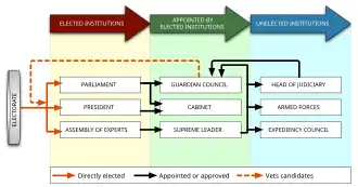 The Supreme Leader is appointed by the Assembly of Experts. All candidates to the Assembly of Experts, the President and the Majlis (Parliament), are selected by the Guardian Council, half of whose members are selected by the Supreme Leader of Iran.[76] All directly elected members after the vetting process by the Guardian Council still have to be approved by the Supreme Leader.[77][78]