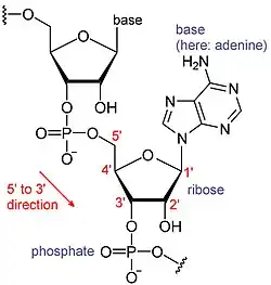 RNAs are a type of large biological molecules, whose individual building blocks are called nucleotides. The name poly(A) tail (for polyadenylic acid tail)[8] reflects the way RNA nucleotides are abbreviated, with a letter for the base the nucleotide contains (A for adenine, C for cytosine, G for guanine and U for uracil). RNAs are produced (transcribed) from a DNA template. By convention, RNA sequences are written in a 5′ to 3′ direction. The 5′ end is the part of the RNA molecule that is transcribed first, and the 3′ end is transcribed last. The 3′ end is also where the poly(A) tail is found on polyadenylated RNAs.[1][9]