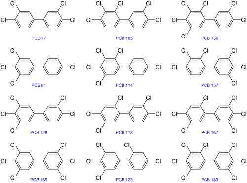 - The coplanar group members have a fairly rigid structure, with their two phenyl rings in the same plane. It renders their structure similar to polychlorinated dibenzo-p-dioxins (PCDDs) and polychlorinated dibenzofurans, and allows them to act like PCDDs, as an agonist of the aryl hydrocarbon receptor (AhR) in organisms. They are considered as contributors to overall dioxin toxicity, and the term dioxins and dioxin-like compounds is often used interchangeably when the environmental and toxic impact of these compounds is considered.[15][16]
