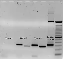 Schematic drawing of a complete PCR cycleEthidium bromide-stained PCR products after gel electrophoresis. Two sets of primers were used to amplify a target sequence from three different tissue samples. No amplification is present in sample #1; DNA bands in sample #2 and #3 indicate successful amplification of the target sequence. The gel also shows a positive control, and a DNA ladder containing DNA fragments of defined length for sizing the bands in the experimental PCRs.
