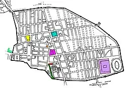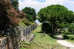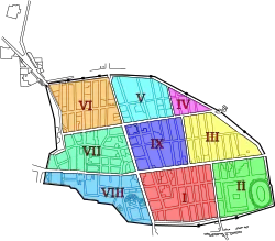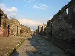 In the early 6th century BC, the settlement merged into a single community centred on the important crossroad between Cumae, Nola, and Stabiae and was surrounded by a tufa city wall (the pappamonte wall).[22][23] The first wall (which was also used as a base for the later wall) unusually enclosed a much greater area than the early town together with much agricultural land.[24] That such an impressive wall was built at this time indicates that the settlement was already important and wealthy. The city began to flourish and maritime trade started with the construction of a small port near the mouth of the river.[20] The earliest settlement was focused in regions VII and VIII of the town (the old town) as identified from stratigraphy below the Samnite and Roman buildings, as well as from the different and irregular street plan.