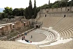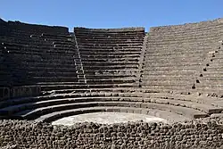 The city became an important passage for goods that arrived by sea and had to be sent toward Rome or Southern Italy along the nearby Appian Way. Many public buildings were constructed or refurbished and improved under the new order; new buildings included the Amphitheatre of Pompeii in 70 BC, the Forum Baths, and the Odeon. In comparison, the Forum was embellished with the colonnade of Popidius before 80 BC.[38] These buildings raised the status of Pompeii as a cultural centre in the region as it outshone its neighbours in the number of places for entertainment which significantly enhanced the social and economic development of the city.