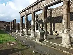 An important field of current research concerns structures that were restored between the earthquake of 62 and the eruption. It was thought until recently that some of the damage had still not been repaired at the time of the eruption, but this is doubtful as the evidence of missing forum statues and marble wall veneers are most likely due to robbers after the city's burial.[44][45] The public buildings on the east side of the Forum were largely restored and were enhanced by beautiful marble veneers and other modifications to the architecture.[46]