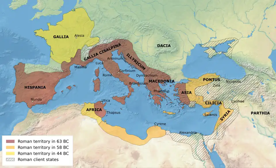 Gnaeus Pompeius Magnus (Latin: [ˈŋnae̯.ʊs pɔmˈpɛjjʊs ˈmaŋnʊs]; 29 September 106 BC – 28 September 48 BC), known in English as Pompey (/ˈpɒmpi/ POM-pee) or Pompey the Great, was a Roman general and statesman who was prominent in the last decades of the Roman Republic. As a young man, he was a partisan and protégé of the dictator Sulla, after whose death he achieved much military and political success himself.
