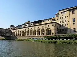 In order to connect the Palazzo Vecchio (Florence's town hall) with the Palazzo Pitti, in 1565 Cosimo I de' Medici had Giorgio Vasari build the Vasari Corridor, part of which runs above the Ponte Vecchio.[5]