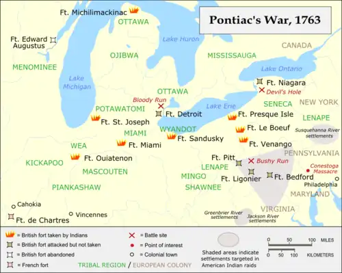 Pontiac's War (also known as Pontiac's Conspiracy or Pontiac's Rebellion) was launched in 1763 by a confederation of Native Americans who were dissatisfied with British rule in the Great Lakes region following the French and Indian War (1754–1763). Warriors from numerous nations joined in an effort to drive British soldiers and settlers out of the region. The war is named after Odawa leader Pontiac, the most prominent of many Indigenous leaders in the conflict.