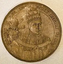 Pope Boniface IX (Latin: Bonifatius IX; Italian: Bonifacio IX; c. 1350 – 1 October 1404, born Pietro Tomacelli Cybo[1]) was head of the Catholic Church from 2 November 1389 to his death, in October 1404. He was the second Roman pope during the Western Schism.[2] In this time, the Avignon claimants, Clement VII and Benedict XIII, maintained the Roman Curia in Avignon, under the protection of the French monarchy. He is the last pope to date to take on the pontifical name "Boniface".