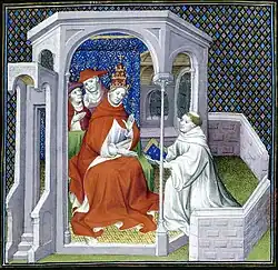 Two weeks later at Vienne, Bertrand was informally notified of his election and returned to Bordeaux.[6] At Bordeaux he was formally recognized as pope, with John of Havering offering him gifts from Edward I of England.[7] Bertrand initially selected Vienne as the site for his coronation, but after Philip IV's objections selected Lyon.[7] On 14 November 1305, Bertrand was installed as pope which was celebrated with magnificence and attended by Philip IV.[8] Among his first acts was the creation of nine French cardinals.[9]