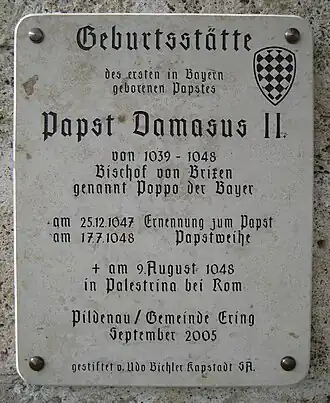 Pope Damasus II (/ˈdæməsəs/; died 9 August 1048, born Poppo von Brixen)[1] was the Bishop of Rome and ruler of the Papal States from 17 July 1048 to his death on 9 August that same year. He was the second of the German pontiffs nominated by Emperor Henry III. A native of Bavaria, he was the third German to become pope and had one of the shortest papal reigns.[2]