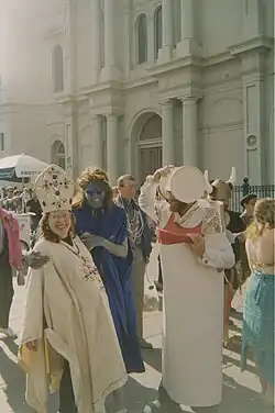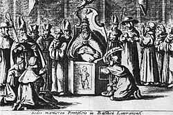 Jean de Mailly's chronicle, written around 1250, contains the first known mention of an unnamed female pope and inspired several more accounts over the next several years. The most popular and influential version is that interpolated into Martin of Opava's Chronicon Pontificum et Imperatorum later in the 13th century. Martin introduced details that the female pope's birth name was John Anglicus of Mainz, that she reigned in the 9th century and that she entered the church to follow her lover.[8] The existence of Pope Joan was used in the defence of Walter Brut in his trial of 1391.[9] Her existence was generally accepted as true until the 16th century, when a widespread debate among Catholic and Protestant writers called the story into question: various writers noted the implausibly long gap between Joan's supposed lifetime and her first appearance in texts.[10][11] Protestant scholar David Blondel ultimately demonstrated the impossibility of the story in his 1647 treatise on the issue.[12][13] Pope Joan is now widely considered fictional, though the legend remains influential in cultural depictions.[14][15]