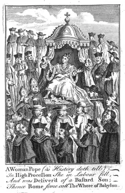 An English writer, Alexander Cooke, wrote a book entitled Pope Joane: A Dialogue between a Protestant and a Papist, which purported to prove the existence of Pope Joan by reference to Catholic traditions.[27] It was republished in 1675 as A Present for a Papist: Or the Life and Death of Pope Joan, Plainly Proving Out of the Printed Copies, and Manscriptes of Popish Writers and Others, That a Woman called Joan, Was Really Pope of Rome, and Was There Deliver'd of a Bastard Son in the Open Street as She Went in Solemn Procession.[27][28] The book gives an account of Pope Joan giving birth to a son in plain view of all those around, accompanied by a detailed engraving showing a rather surprised looking baby peeking out from under the Pope's robes. Even in the 19th century, authors such as Ewaldus Kist and Karl Hase discussed the story as a real occurrence. However, other Protestant writers, such as David Blondel and Gottfried Leibniz, rejected the story.