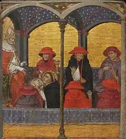 Pantaléon returned from Jerusalem, which was in dire straits,[1] and was at Viterbo seeking help for the oppressed Christians in the East when Alexander IV died. After a three-month vacancy, the eight cardinals of the Sacred College chose him to succeed Alexander IV in a papal election on 29 August 1261. He chose the regnal name of Urban IV, and was crowned in the church of Santa Maria a Gradi on September 4.[2]
