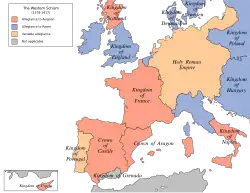 Map showing support for Avignon (red) and Rome (blue) during the Western Schism