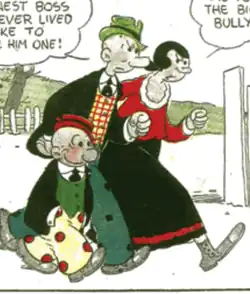 In July 1933, Popeye received a foundling baby in the mail whom he adopted and named Swee'Pea. Other regular characters introduced into the strip following its retool in 1930 were George W. Geezil, an irascible cobbler who spoke in a heavily affected accent and habitually attempted to murder or wish death upon Wimpy; Rough-House, the temperamental owner of a budget diner who served as a long-suffering foil to Wimpy; Eugene the Jeep, a yellow, vaguely doglike animal from Africa with magical powers; the Sea Hag, a terrible pirate and the last witch on Earth; Alice the Goon, a monstrous creature who entered the strip as the Sea Hag's henchwoman and continued as Swee'Pea's babysitter; the hapless, perpetually anxious King Blozo; Blozo's unintelligent lackey Oscar; Popeye's lecherous, scheming father Poopdeck Pappy; and Toar, an ageless, dim-witted caveman.[24][22]