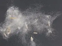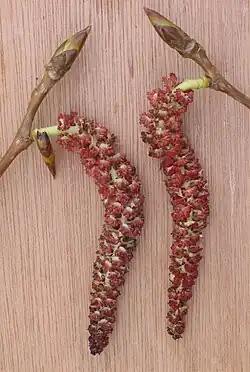 The flowers are mostly dioecious (rarely monoecious) and appear in early spring before the leaves. They are borne in long, drooping, sessile or pedunculate catkins produced from buds formed in the axils of the leaves from the previous year. The flowers are each seated in a cup-shaped disk which is borne on the base of a scale which is itself attached to the rachis of the catkin. The scales are obovate, lobed, and fringed, membranous, hairy or smooth, and usually caducous. The male flowers are without calyx or corolla, and comprise a group of four to 60 stamens inserted on a disk; filaments are short and pale yellow; anthers are oblong, purple or red, introrse, and two-celled; the cells open longitudinally. The female flower also has no calyx or corolla, and comprises a single-celled ovary seated in a cup-shaped disk. The style is short, with two to four stigmata, variously lobed, and numerous ovules. Pollination is by wind, with the female catkins lengthening considerably between pollination and maturity. The fruit is a two- to four-valved dehiscent capsule, green to reddish-brown, mature in midsummer, containing numerous minute, light-brown seeds surrounded by tufts of long, soft, white hairs aiding wind dispersal.[5][7]