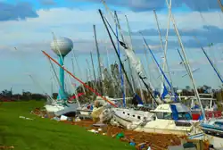 On September 24, 2005, Hurricane Rita made landfall between Sabine Pass, Texas, and Johnson Bayou, Louisiana, as a category 3 hurricane. A wind gust of 116 mph (187 km/h) was recorded in Port Arthur. The storm caused widespread significant wind damage throughout the city, with power outages lasting several weeks in some locations. Some areas of the city also received flooding due to Rita.[23]