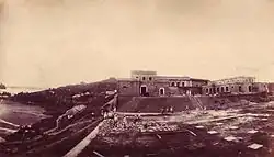 In 1789, Archibald Blair of the Royal Indian Navy colonised the Andaman islands, and established a naval base.[4] In 1794, a penal colony was established on the Chatham island and the first batch of 100 prisoners were sent to the island. The prisoners were used for labour, and worked under a civil contract. After two years, the colony was abandoned.[5] On 22 February 1858, the British re-established a colony at Port Blair, named after Archibald Blair.[4][5] A new penal colony was established on the Ross Island near Port Blair, mainly to house the prisoners of the Indian rebellion of 1857, and the first set of 200 convicts arrived at the island in March 1858.[5][6] The prisoners were used for hard labour and the clearing of forests led to frequent confrontation with the native Andamanese people. Many of the prisoners died in conflict, while some were hanged for trying to escape, apart from deaths due to disease and starvation.[4] Between 1864 and 1867, a penal establishment was also built on the nearby Viper Island using prison labour.[7] In 1872, the Andaman and Nicobar Islands were united under a single command and administered by a chief commissioner based out of Port Blair. The construction of the Cellular Jail started in 1896 and was completed in 1906. The jail was used to house political prisoners and independence activists away from the Indian mainland.[8][9]