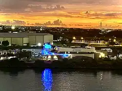 The Mauritius Ports Authority (MPA), established by law in 1998, is the port authority responsible for Port Louis.[31] The MPA provides port infrastructure, enters into contracts with private providers for port and cargo-handling services, promotes the use and development of the ports, and licenses and regulates port and marine services. The harbour adjoins the main city, with the port currently comprising three terminals.[32] Terminal I contains a total of 1,180 m (3,870 ft) of quay, with six berthing positions for cargo, passengers, and fishing boats. Terminal II contains 986 m (3,235 ft) of quays with six berthing positions and includes specialized facilities for handling and storing sugar, fish, tallow, and caustic soda. In particular, the Bulk Sugar Terminal (operated by the Mauritius Sugar Terminal Corporation) can handle vessels with up to 11 m (36 ft) of draft, can load sugar at a rate of 1450 tons per hour, and can store 175,000 tons of cargo. Also present in Terminal II is a dedicated 124 m (407 ft) cruise ship jetty, with a dredged depth of 10.8 m (35 ft). Terminal III has two 280 m (920 ft) quays with a depth of 14 m (46 ft), and is specialized for handling container ships, having three super-post-Panamax and five post-Panamax gantry cranes. Also present are storage facilities for bulk ethanol and tie-in points for reefer containers. Vessels too large to dock at the quays can anchor at the Outer Anchorage, which is still within the official boundaries of the port.
