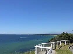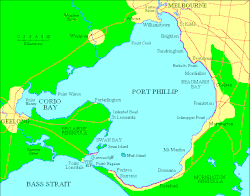 Port Phillip (Kulin: Narm-Narm[1]) or Port Phillip Bay is a horsehead-shaped enclosed bay on the central coast of southern Victoria, Australia. The bay opens into the Bass Strait via a short, narrow channel known as The Rip, and is completely surrounded by localities of Victoria's two largest cities — metropolitan Greater Melbourne in the bay's main eastern portion north of the Mornington Peninsula, and the city of Greater Geelong in the much smaller western portion (known as the Corio Bay) north of the Bellarine Peninsula. Geographically, the bay covers 1,930 km2 (750 mi2) and the shore stretches roughly 264 km (164 mi), with the volume of water around 25 km3 (6.0 cu mi). Most of the bay is navigable, although it is extremely shallow for its size — the deepest portion is only 24 m (79 ft) and half the bay is shallower than 8 m (26 ft). Its waters and coast are home to seals, whales, dolphins, corals and many kinds of seabirds and migratory waders.