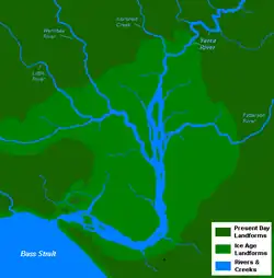 Port Phillip formed between the end of the last Ice Age around 8000 BCE and around 6000 BCE,[3] when the sea-level rose to drown the vast river plains, wetlands and lakes at what was then the lower reaches of the Yarra River. The ancient Yarra and its tributaries (the other present-day rivers of the Port Phillip catchment) flowed down what is now the middle of the bay, formed a coastal lake in the southern reaches of the bay dammed by The Heads, and subsequently pouring out into a closed bay that formed over the western portion of the prehistoric Bassian Plain, which was later completely flooded and became Bass Strait.[4]