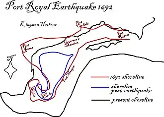 On 7 June 1692, a devastating earthquake hit the city causing most of its northern section to be lost, and with it many of the town's houses and other buildings. Many of the forts were destroyed, as well. Fort Charles survived, but Forts James and Carlisle sank into the sea, Fort Rupert became a large region of water, and great damage was done to an area known as Morgan's Line.