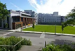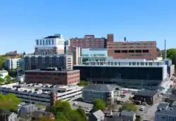 Since the 1990s, the historically industrial Bayside neighborhood has seen rapid development, including attracting a Whole Foods Market and Trader Joe's grocery stores, as well as Baxter Academy for Technology and Science, a charter school. Other developing neighborhoods include the India Street neighborhood, near the Ocean Gateway, and Munjoy Hill, where many modern condominiums have been built.[23][24][25] The Maine College of Art has been a revitalizing force downtown, attracting students from around the country. The historic Porteous Building on Congress Street was restored by the college. Universities operating in the city are expanding. The University of Southern Maine is improving its Portland campus with a 580-bed dormitory, student center, and an arts center. The University of New England intends to move its medical school from its Biddeford campus to its Portland campus. Northeastern University's Roux Institute plans to build on the former B&M Baked Beans factory campus in East Deering.[26]