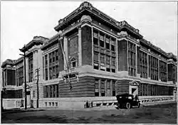 The first classes were held in the Vanport Junior High School and given its location in the Columbia River floodplain was promptly given the colloquial title, "The U by the Slough."[7] This first summer session had 221 students, and tuition and fees were $50. Over 1,410 students registered for the 1946 fall term, which was delayed until October 7, 1946, due to a lack of space. Since the population in Vanport was decreasing after World War II, the extension center was able to use buildings created for other purposes: two childcare centers, a recreation building with three classrooms, and a shopping center, which required substantial modification to house a library, offices, and six classrooms. In addition to Vanport Junior High School,[8] Lincoln and Jefferson high schools were used after school hours, as well as the University of Oregon's dental and medical schools, located in Portland.