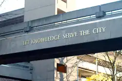 Architecture at the university was a topic of controversy in its early stages. In 1968, incoming university president Gregory Wolfe commented that the buildings were distressing evidence of Stalinist cubism on campus, although urban renewal chairman Ira Keller found them to be "perfectly lovely."[12] Portland State University's growth for the next couple of decades was restricted under the Oregon University System's 1929 ruling that no public university or college in Oregon could duplicate the programs offered by another, with grandfathered exclusions for the University of Oregon and Oregon State University.[13] Nevertheless, graduate programs were added in 1961 and doctoral programs were added in 1972.[2] The institution was granted university status by the Oregon State Board of Higher Education in 1969, becoming Portland State University.