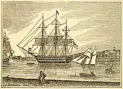 In 1855, the Portsmouth and Norfolk area suffered an epidemic of yellow fever which killed 1 of every three citizens.[13] On June 6, 1855, the Benjamin Franklin vessel arrived in Hampton Roads for repairs.[13] The ship had just sailed from the West Indies, where there had been an outbreak of yellow fever.[13] The port health officer ordered the ship quarantined. After twelve days, a second inspection found no issues, so it was allowed to dock at the Gosport Shipyard in Portsmouth.[13] Workers from the shipyard began to fall ill, and it was later discovered that the ship's captain had concealed sailors who were suffering from the disease.[13] Some of the workers from the shipyard lived in Norfolk, and returned home by taking the ferry across the Elizabeth River, taking the yellow fever with them.[13] The poor and immigrants were the first to fall ill.[13] At the time, no one understood how the disease was transmitted, though it was later determined to have spread via mosquitoes and poor sanitation.[13] This lack of understanding led to widespread panic, and about one-third of Portsmouth's 10,000 residents fled the region in the hopes of escaping the epidemic.[13][14] New York banned all persons and vessels from the region, since both Norfolk and Portsmouth were infected.[13][14] Washington, D.C., Baltimore, Richmond, Petersburg, and Suffolk also banned persons from the region.[14] Mathews County and the Eastern Shore remained open to those fleeing the illness.[14] The Gosport Navy Yard remained open, but more than 1,000 shipyard workers left.[14] By the end of August, only 3,000 residents remained in Portsmouth.[14] The number of infected reached 5,000 in September, and by the second week of September, a combined 1,500 had died in Norfolk and Portsmouth.[13][14] As fall arrived and the weather cooled, the outbreak began to wane, leaving a final tally of about 3,200 dead in the region.[14]