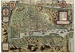 Francisco de Almeida, the first viceroy, established his base of operations at Fort Manuel in the Malabar region, after the Kingdom of Cochin negotiated to become a protectorate of Portugal in 1505. With the Portuguese conquest of Goa from the Bijapur Sultanate in 1510, Goa became the major anchorage for the Armadas arriving in India. The capital of the viceroyalty was transferred from Cochin to Goa in 1530.[7][8] From 1535, Mumbai (Bombay) was a harbour of Portuguese India, known as Bom Bahia, until it was handed over to Charles II of England in 1661 as part of the dowry of Catherine de Braganza. The expression "State of India" began regularly appearing in documents in the mid-16th century.[9]