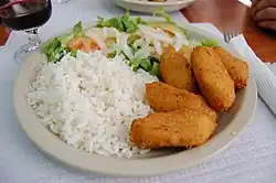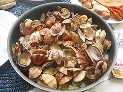 Portuguese dishes are based on the Atlantic diet and include meats (pork, beef, poultry mainly; also game and others), seafood (fish, crustaceans such as lobster, crab, shrimps, prawns, octopus, and molluscs such as scallops, clams and barnacles), numerous vegetable varieties (brassica family), legumes and desserts (cakes being the most numerous). Portuguese often consume rice, potatoes, rapini (known as grelos), and bread with their meals, and there are numerous varieties of traditional fresh breads like broa,[6][7][8] which may also have regional and national variations within the countries under Lusophone or Galician influence.[2][9] In a wider sense, Portuguese and Galician cuisine share many traditions and features.[10]