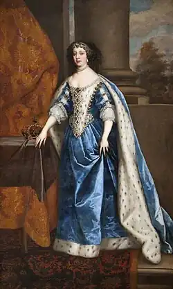Tea was made fashionable in England in the 1660s after the marriage of King Charles II to the Portuguese princess Catherine of Braganza (Catarina De Bragança), who brought her liking for tea, originally from the colony of Macau, to the court.[79] When Catherine relocated up north to join King Charles, she is said to have packed loose-leaf tea as part of her personal belongings; it would also have likely been part of her dowry. Queen Catherine also introduced marmalade to the English and made the habit of eating with a fork a part of the court's table etiquette.[80]