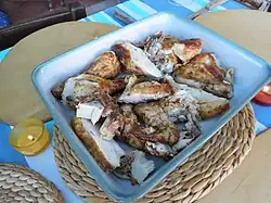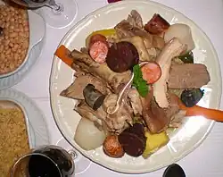 Many other meat dishes feature in Portuguese cuisine. In the Bairrada area, a famous dish is Leitão à Bairrada (roasted suckling pig). Nearby, another dish, chanfana (goat slowly cooked in red wine, paprika and white pepper) is claimed by two towns, Miranda do Corvo ("Capital da Chanfana")[25] and Vila Nova de Poiares ("Capital Universal da Chanfana").[26] Carne de porco à alentejana, fried pork with clams, is a popular dish with some speculation behind its name and its origin as clams would not be as popular in Alentejo, a region with only one sizeable fishing port, Sines, and small fishing villages but would instead have a much popular usage in the Algarve and its seaside towns. One of the theories as to why the plate may belong to the Algarve is that pigs in the region used to be fed with fish derivatives, so clams were added to the fried pork to disguise the fishy taste of the meat.[27] The dish was used in the Middle Ages to test Jewish converts' new Christian faith; consisting of pork and shellfish (two non-kosher items), Cristãos-novos were expected to eat the dish in public in order to prove they had renounced the Jewish faith.[28] In Alto Alentejo (North Alentejo), there is a dish made with lungs, blood and liver, of either pork or lamb. This traditional Easter dish is eaten at other times of year as well. A regional, islander dish, alcatra, beef marinated in red wine, garlic and spices like cloves and whole allspice, then roasted in a clay pot, is a tradition of Terceira Island in the Azores.