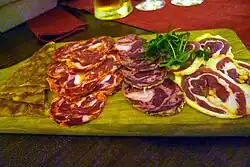 Portuguese cold cuts and sausages (charcutaria and enchidos, respectively) have long and varied traditions in meat preparation, seasoning, preservation and consumption: cured, salted, smoked, cooked, simmered, fermented, fried, wrapped, dried. Regional variations in form and flavour, specialities and names also occur. Further pork (and other meats) charcuterie products include toucinho, paio, morcela, beloura, bucho, butelo, cacholeira, maranho, pernil, salpicão and others.[44][45]