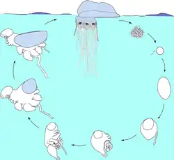 Man o' war individuals are dioecious, meaning each colony is either male or female.[20] Gonophores producing either sperm or eggs (depending on the sex of the colony) sit on a tree-like structure called a gonodendron, which is believed to drop off from the colony during reproduction.[20] The eggs and sperm are released from gonophores directly into the water.[26] As neither fertilization nor early development has been directly observed in the wild, it is not yet known at what depth these occur.[20]