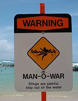 The Portuguese man o' war is a member of the neuston, organisms that live on the surface of bodies of water. This community is exposed to a unique set of environmental conditions including prolonged exposure to intense ultraviolet light, risk of desiccation, and rough sea conditions.[32] The gas-filled bladder, or pneumatophore, remains at the surface, while the remainder is submerged. The animal has no means of propulsion; it moves passively, driven by the winds, currents, and tides. Winds can drive them into bays or onto beaches.[30] The Portuguese man o' war is well known to beachgoers for the painful stings delivered by its tentacles.[24] Because they can sting while beached, the discovery of a man o' war washed up on a beach may lead to the closure of the beach.[33][34]