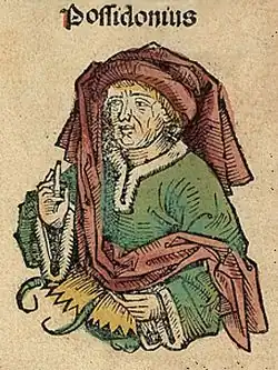 Posidonius (/ˌpɒsɪˈdoʊniəs/; Ancient Greek: Ποσειδώνιος Poseidṓnios, "of Poseidon") "of Apameia" (ὁ Ἀπαμεύς) or "of Rhodes" (ὁ Ῥόδιος) (c. 135 – c. 51 BC), was a Greek politician, astronomer, astrologer,[1] geographer, historian, mathematician, and teacher native to Apamea, Syria.[2][3][4][5][6] He was considered the most learned man of his time and, possibly, of the entire Stoic school.[7] After a period learning Stoic philosophy from Panaetius in Athens, he spent many years in travel and scientific researches in Spain, Africa, Italy, Gaul, Liguria, Sicily and on the eastern shores of the Adriatic. He settled as a teacher at Rhodes where his fame attracted numerous scholars. Next to Panaetius he did most, by writings and personal lectures, to spread Stoicism to the Roman world, and he became well known to many leading men, including Pompey and Cicero.
