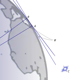 Posidonius calculated the Earth's circumference by the arc measurement method, by reference to the position of the star Canopus.[44] As explained by Cleomedes, Posidonius observed Canopus on but never above the horizon at Rhodes, while at Alexandria he saw it ascend as far as 7½ degrees above the horizon (the meridian arc between the latitude of the two locales is actually 5 degrees 14 minutes). Since he thought Rhodes was 5,000 stadia due north of Alexandria, and the difference in the star's elevation indicated the distance between the two locales was 1/48 of the circle, he multiplied 5,000 stadia by 48 to arrive at a figure of 240,000 stadia for the circumference of the Earth.[45]