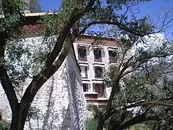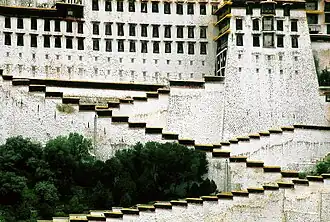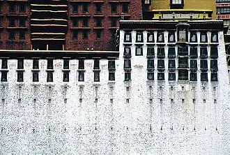 The lower white frontage on the south side of the palace was used to hoist two gigantic thangkas joined representing the figures of Tara and Sakyamuni during the Sertreng Festival on the 30th day of the second Tibetan month.[30][31]