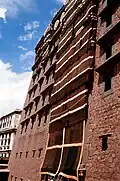 Built at an altitude of about 3,700 metres on Marpo Ri in the centre of the Lhasa Valley,[7] the palace measures 400 m east–west and 350 m north–south. Its sloping stone walls average 3 m thick, 5 m at the base, with copper poured into the foundations for earthquake protection.[8] Rising 13 storeys, the complex contains more than 1,000 rooms, 10,000 shrines, and some 200,000 statues, reaching a height of 119 m above the mountain and over 300 m above the valley floor.[9]