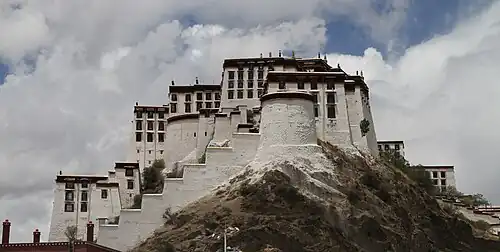 The palace is named after Mount Potalaka, regarded in Buddhist tradition as the mythical abode of the bodhisattva Avalokiteśvara.[2] Construction of the present structure was begun in 1645 at the order of the 5th Dalai Lama,[3] advised by Konchog Chophel, the Thirty-fifth Ganden Tripa of the Gelug school.[4] It was built on the site of an earlier palace attributed to Songtsen Gampo (traditionally dated to 637).[5][6]